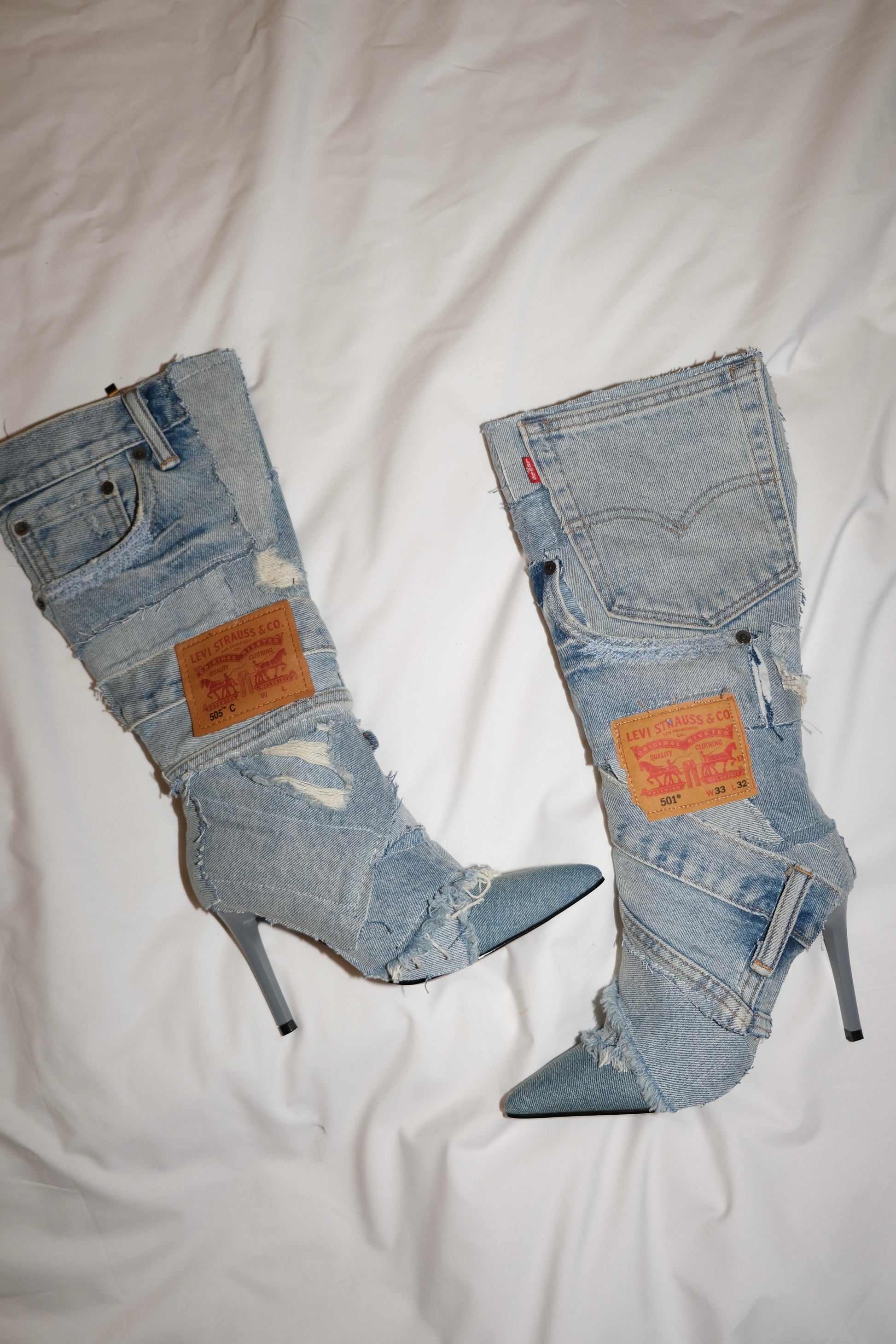 PLEASE NOTE: When buying a pair of denim boots you are buying a piece of handcrafted art. The boot itself is designed by NHC and produced. After production, I carefully selected high quality vintage denim pieces to customise these boots. NO piece is the same! And no piece will ever be the same. These are NHC 1/1 CUSTOM PIECES.
